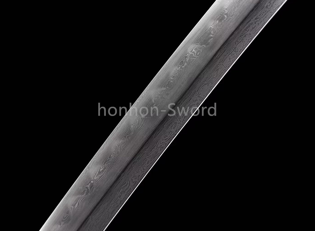 Das Katana-Schwert besteht aus gefaltetem Stahl in Maru-Struktur und verfügt über eine durchgehende Angel, die die Kraft des Schwertes beim Schwingen deutlich erhöht. Vollständig handgeschmiedet, handgeformt und handpoliert in der traditionellsten Schwertherstellungsmethode.