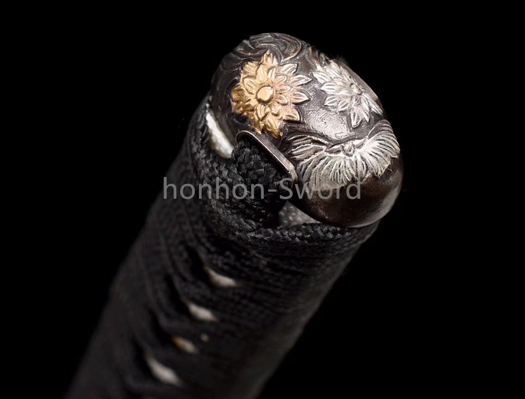L'épée katana est fabriquée en acier plié dans la structure Maru et est livrée avec une soie pleine longueur qui améliore considérablement la résistance de l'épée lors du balancement. Entièrement forgée à la main, mise en forme à la main, polissage à la main selon la méthode de fabrication d'épée la plus traditionnelle.