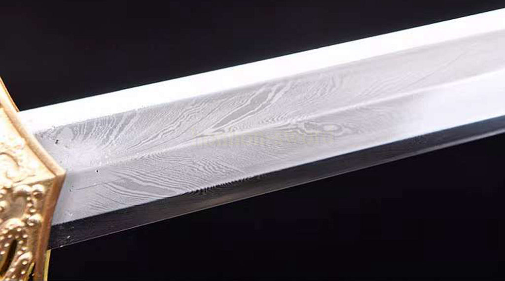 1. La lame a été fabriquée en acier Damas plié dans une structure Maru fondue et pilée pour se plier 13 fois pour créer 8192 couches. couches à plier à des rythmes. Il s'agissait d'un forgeage, d'un façonnage et d'un polissage à la main selon la méthode la plus traditionnelle de fabrication d'épées.