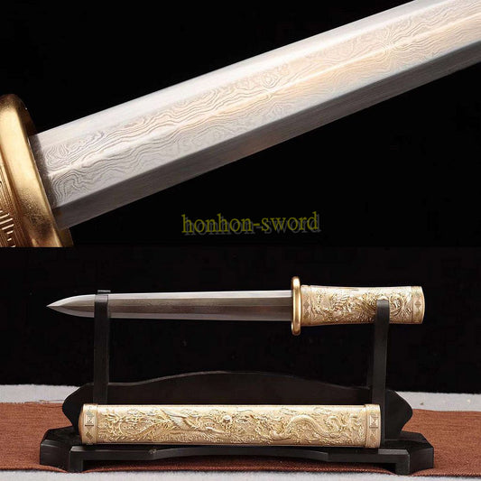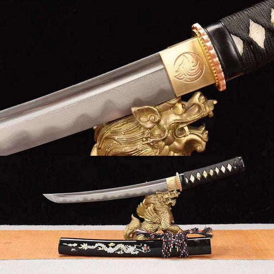 Japanese Tanto Folded Steel UNOKUBI ZUKURI Mini Sword Full Tang Battle Ready Gold