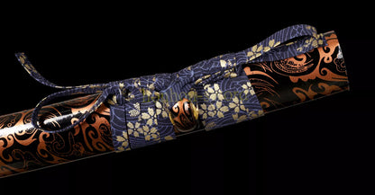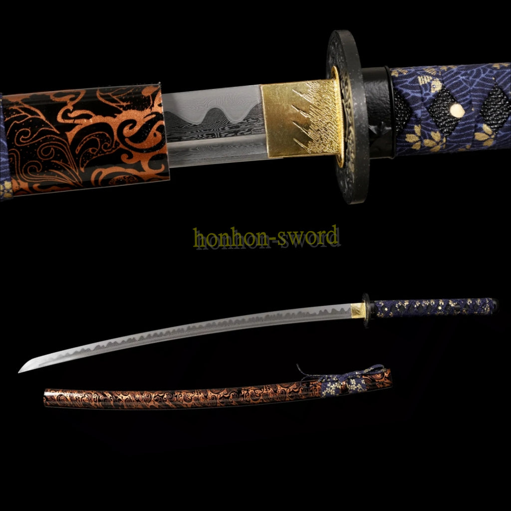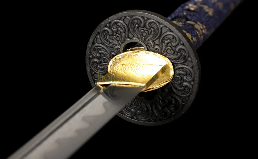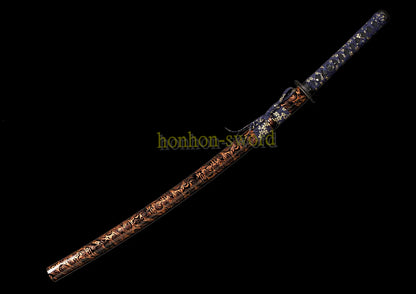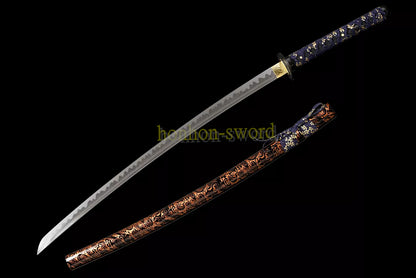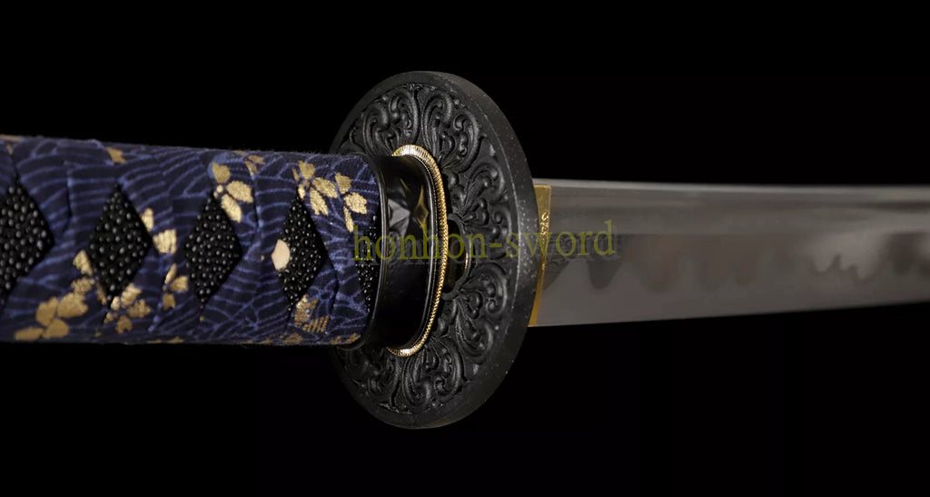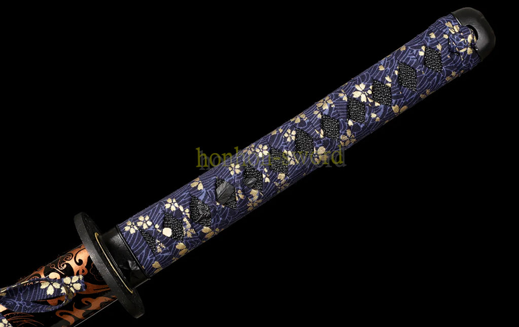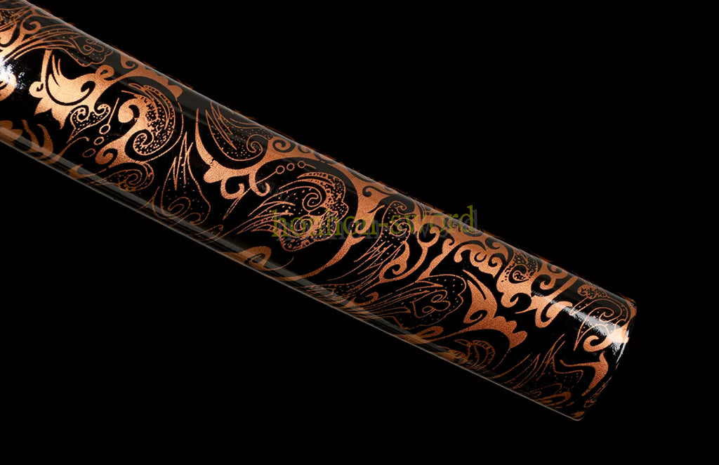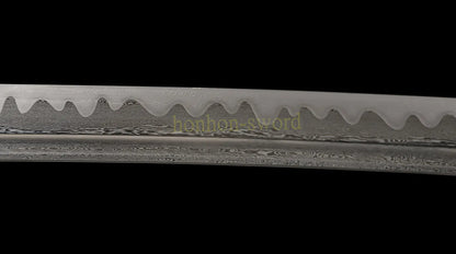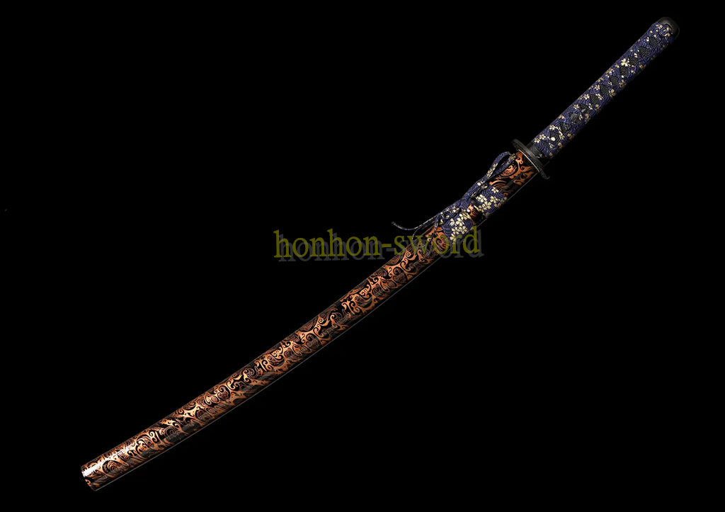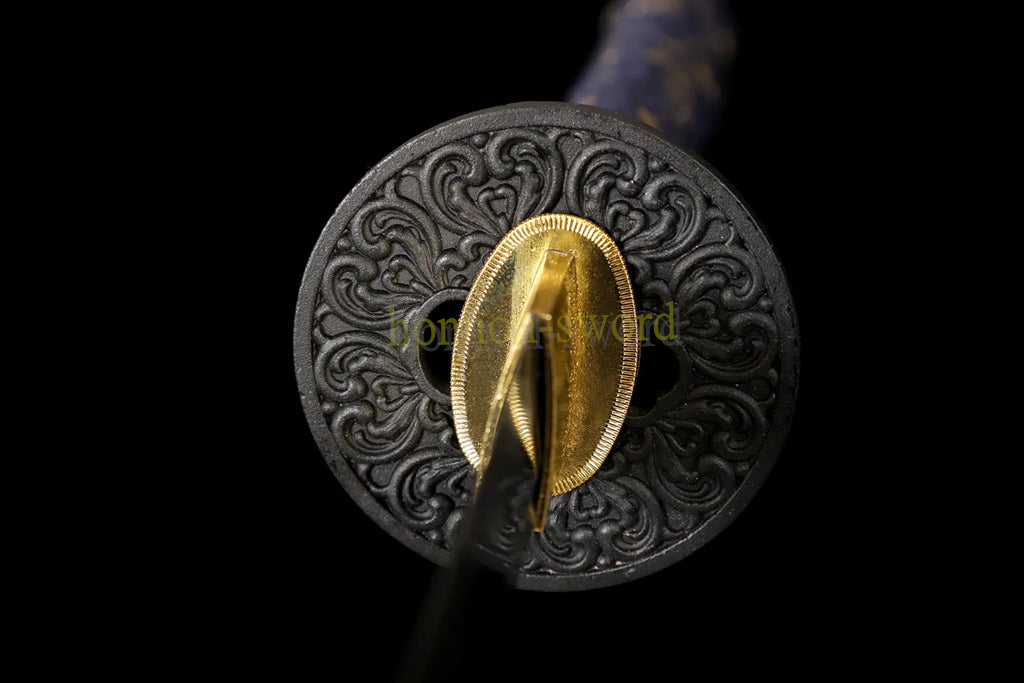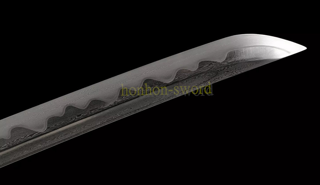 L'épée katana est fabriquée en acier plié dans la structure Maru et est livrée avec une soie pleine longueur qui améliore considérablement la résistance de l'épée lors du balancement. Entièrement forgée à la main, mise en forme à la main, polissage à la main selon la méthode de fabrication d'épée la plus traditionnelle.