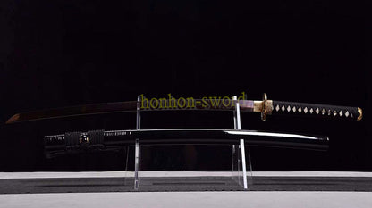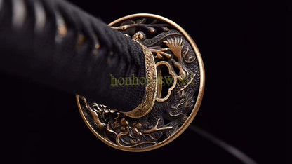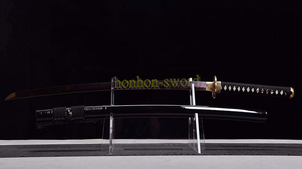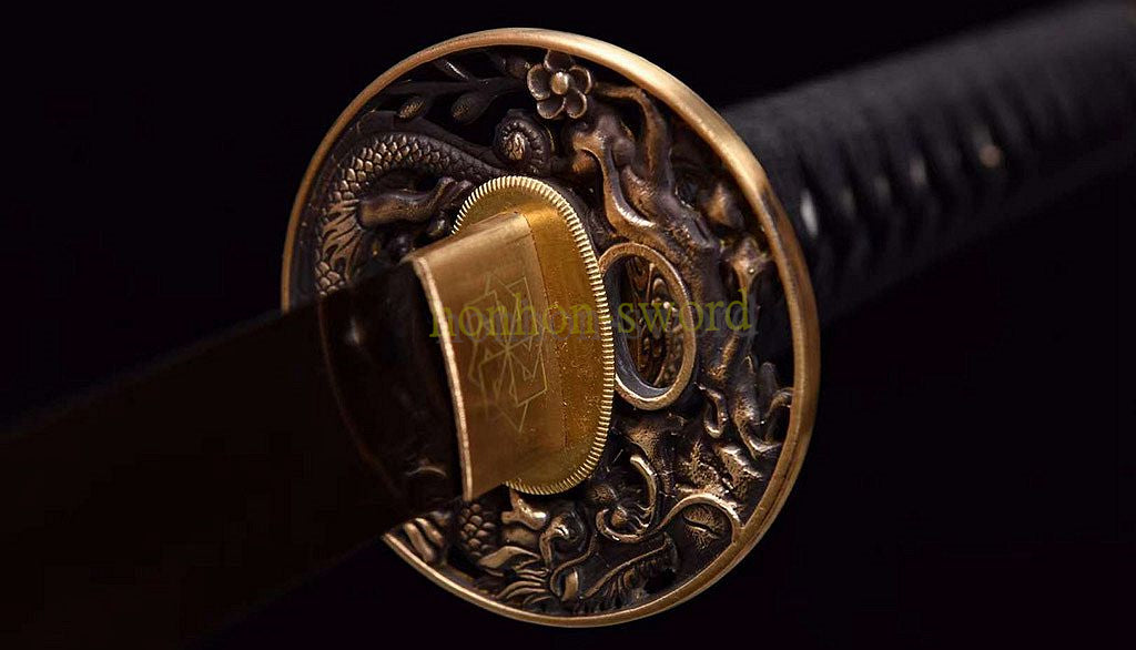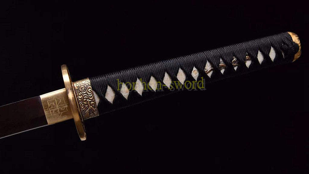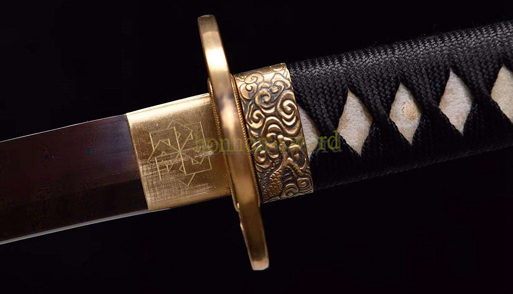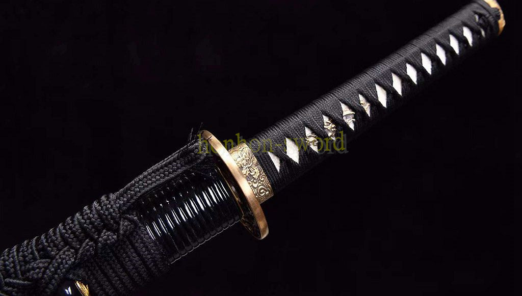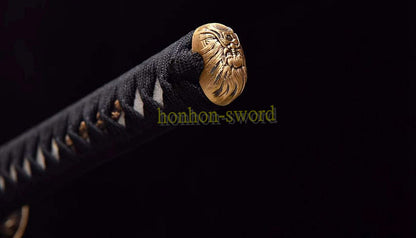 L'épée katana est fabriquée en acier plié dans la structure Maru et est livrée avec une soie pleine longueur qui améliore considérablement la résistance de l'épée lors du balancement. Entièrement forgée à la main, mise en forme à la main, polissage à la main selon la méthode de fabrication d'épée la plus traditionnelle.