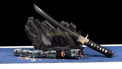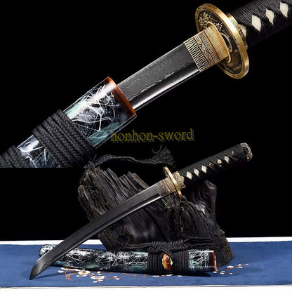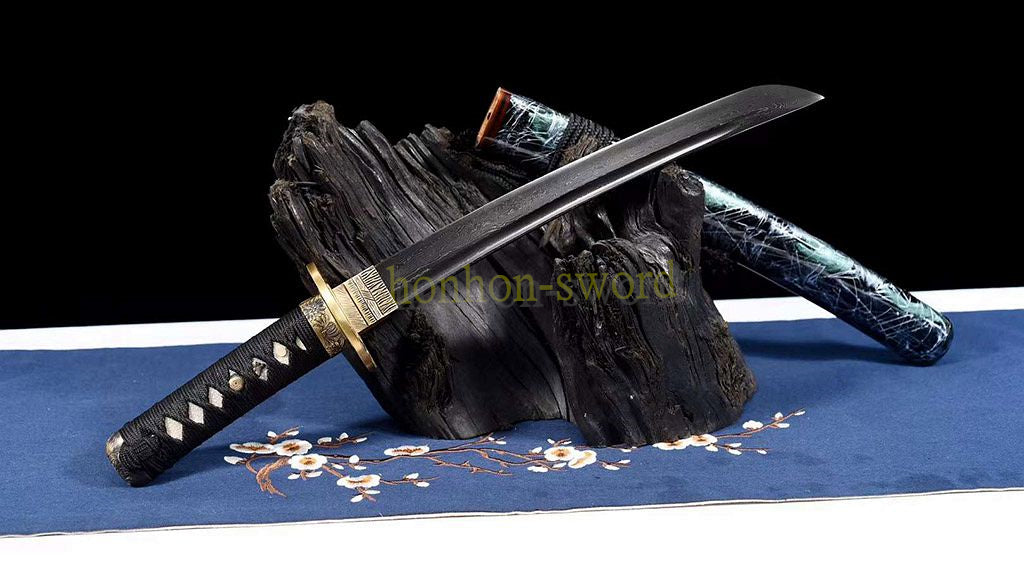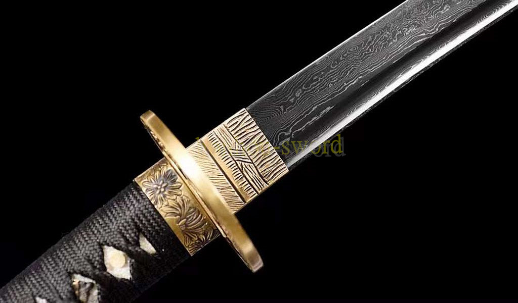 20" Damascus Folded Steel Tanto Black Blade Japanese Samurai Short Sword Ox Horn Saya